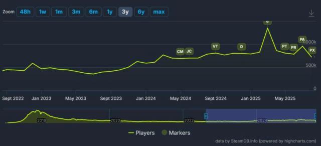 而在这之前的 2024 年,其实随着几次游戏内的更新,人数就已经明显回暖,相比于 22、23 年常常只有三四十万的在线人数,几乎呈翻倍趋势。