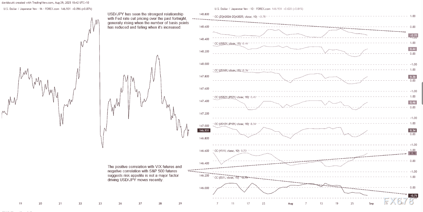 市场预期日本央行年底前加息,市场正权衡这些矛盾信号:互换合约显示,日本央行在年底前再次加息25个基点的概率约为三分之二,且到2026年3月前已完全消化一次加息的预期。尽管市场对日本央行进一步收紧政策的预期为日元提供了一定支撑,但近几周对美元兑日元走势影响更大的,仍是美国利率前景——尤其是市场对联邦基金利率的预期变化。过去两周,2025年6月前美联储降息定价与美元兑日元的相关性高达-0.78,这一关联特征十分清晰。尽管两者并非完全同步,但通常而言,降息预期升温时美元会走弱,反之则美元走强。同期,美元兑日元还与VIX指数期货呈正相关、与标普500指数期货呈负相关,这表明当前风险偏好并非汇价的主要驱动因素。尽管美国国债收益率及其与日本国债的利差呈微弱正相关,但相关性远低于美国短期利率曲线,未来市场注意力应聚焦于美国短期利率的变动。