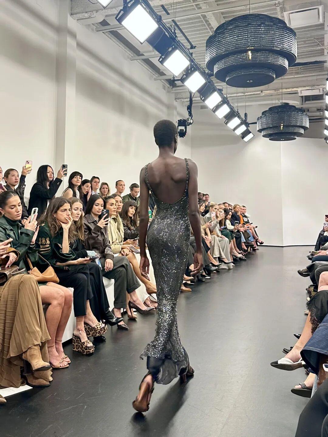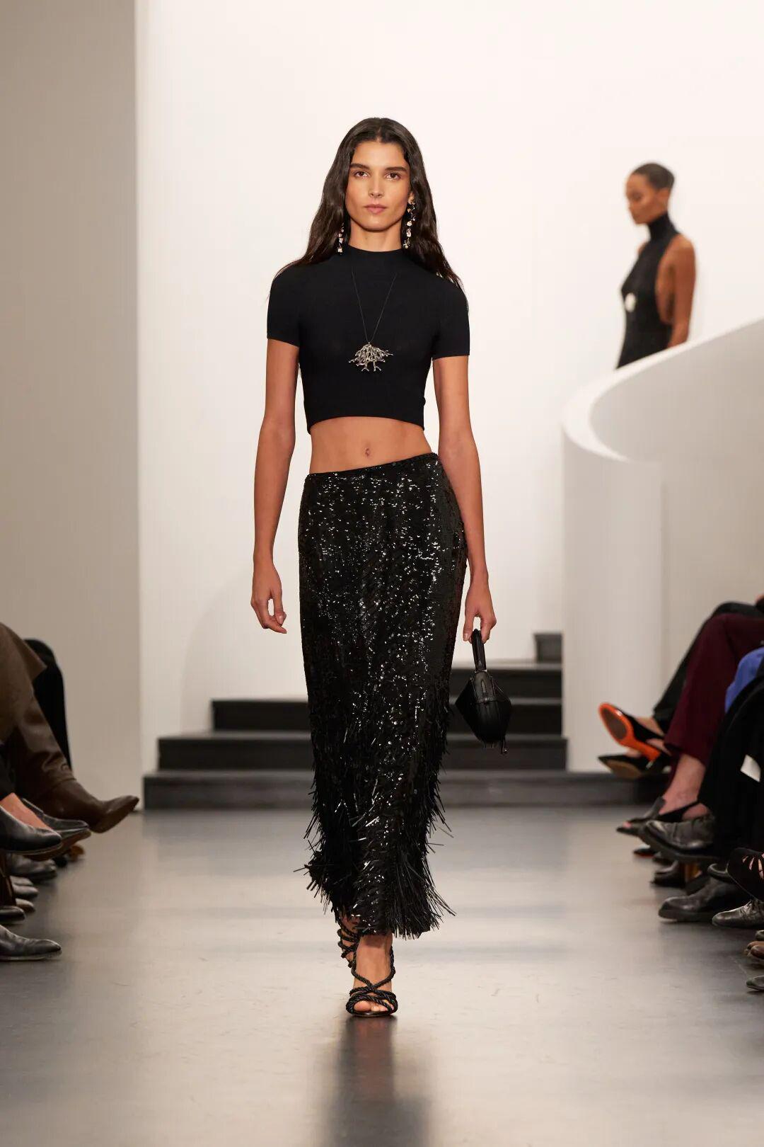 材质的变化同样是Ralph Lauren的拿手好戏。流苏装饰的高领裙,随着模特步伐轻轻颤动,光影折射出隐约的闪烁;