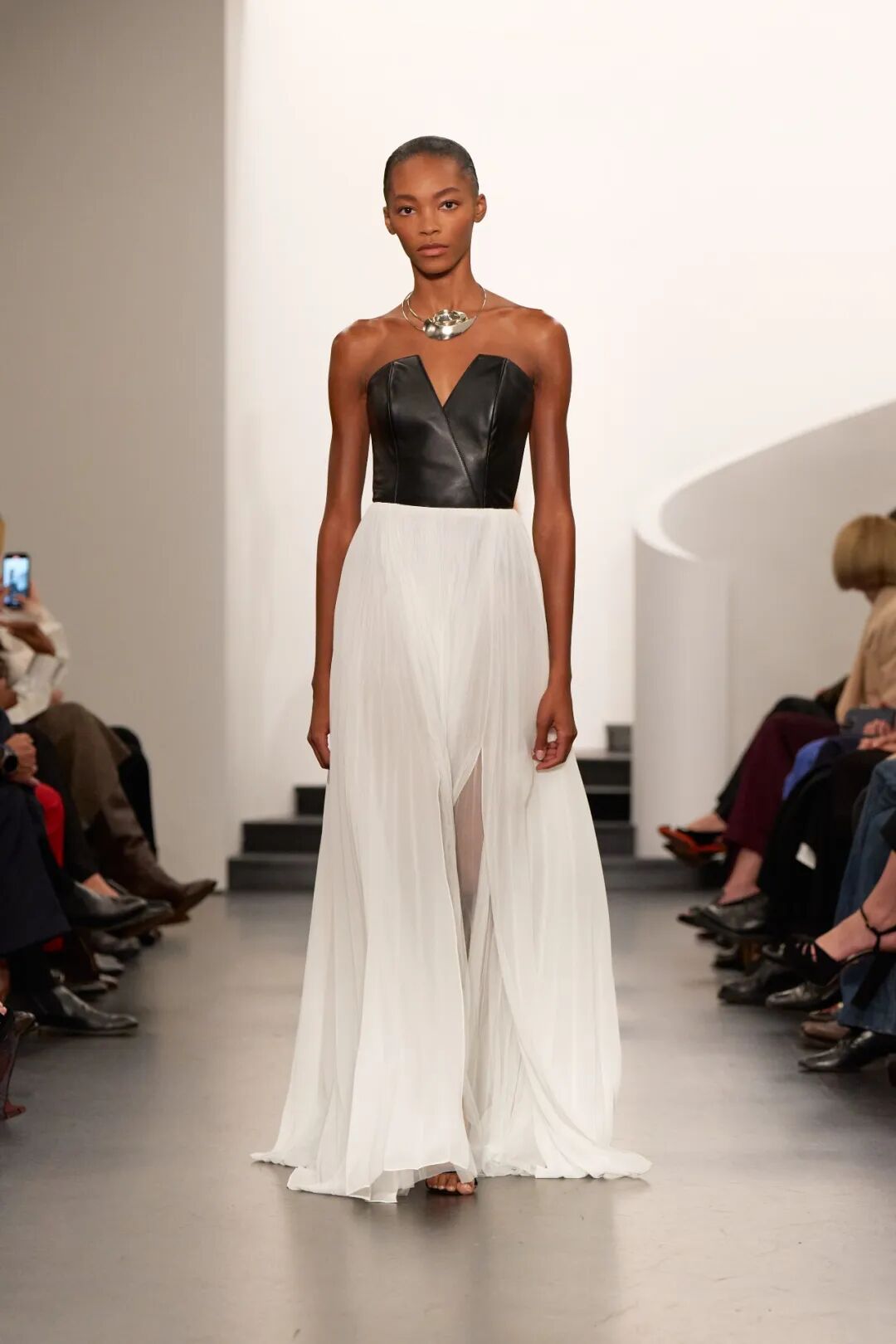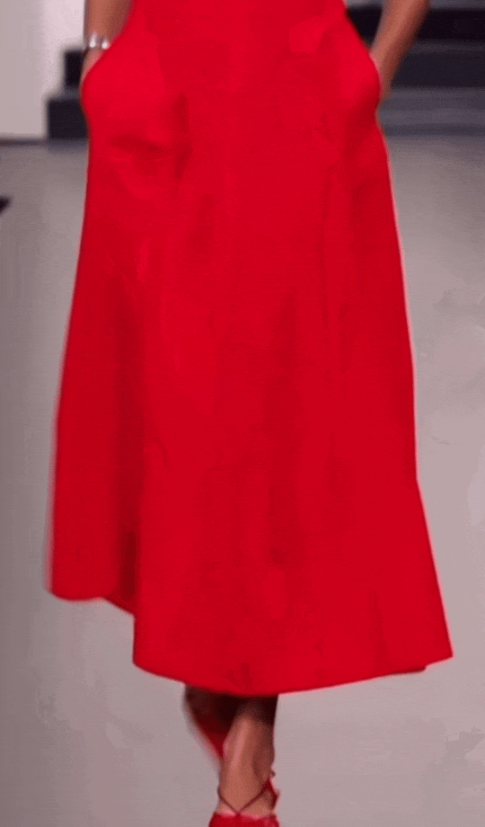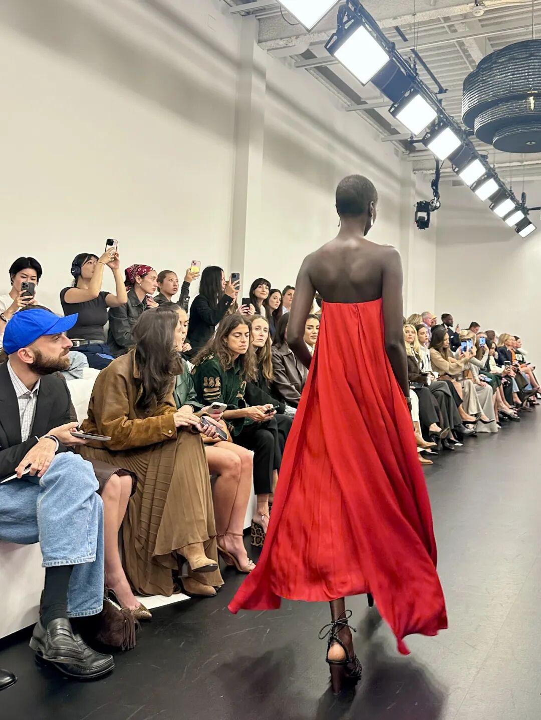 这条烈焰红连衣裙一出场,整个纯白的秀场都被点亮了。胸衣式的上身裁剪勾勒出力量感,裙摆却宽阔而自由,随着步伐荡漾开来,轻盈自在却又有筋骨。