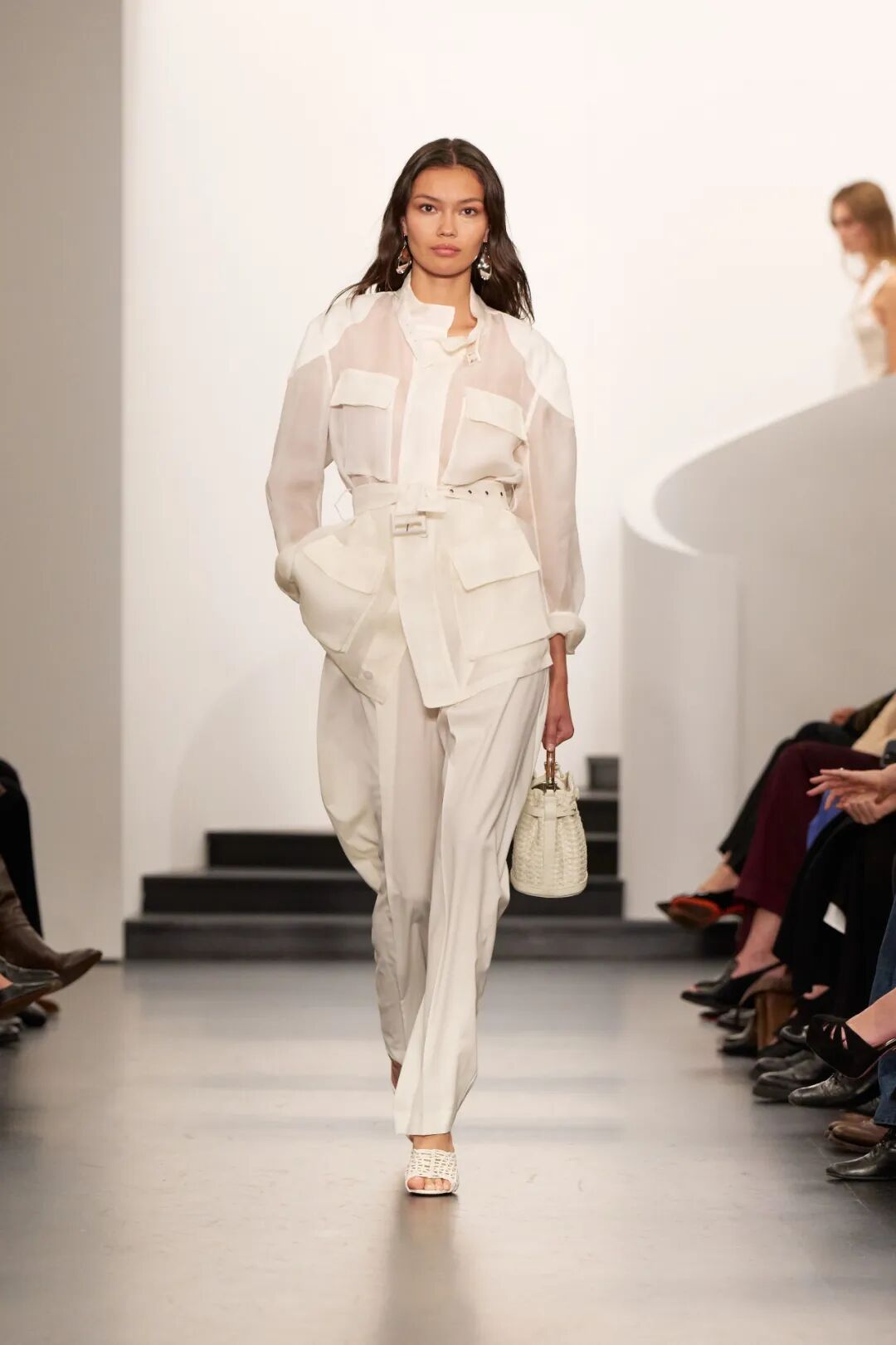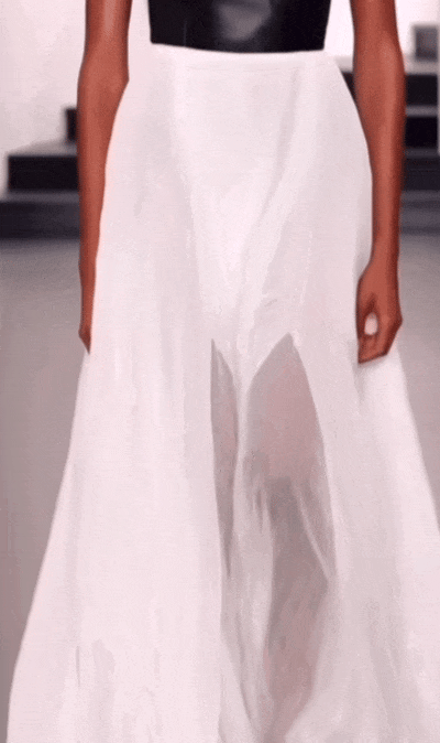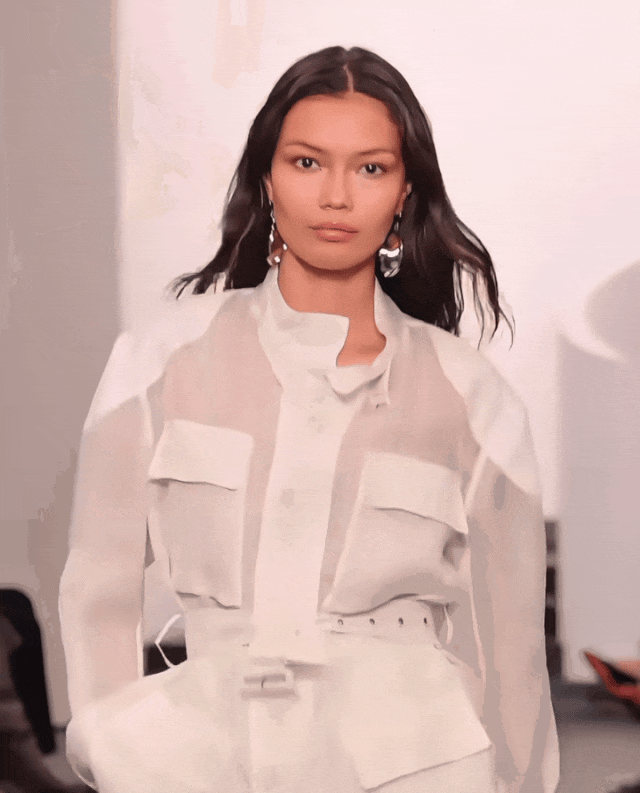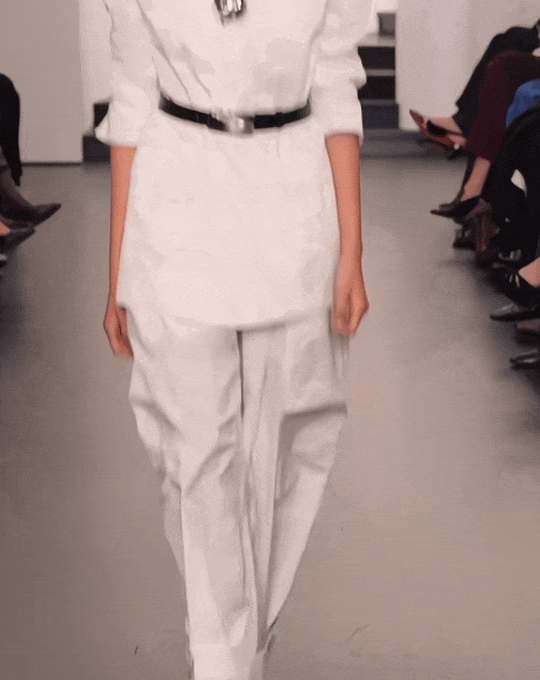 白色半透明衬衫剪裁规整,有清晰的结构感,但面料轻薄到几乎透光,使得整体多了呼吸感。硬朗的廓形和柔软的面料交织,让衣服拥有了双重性格。
