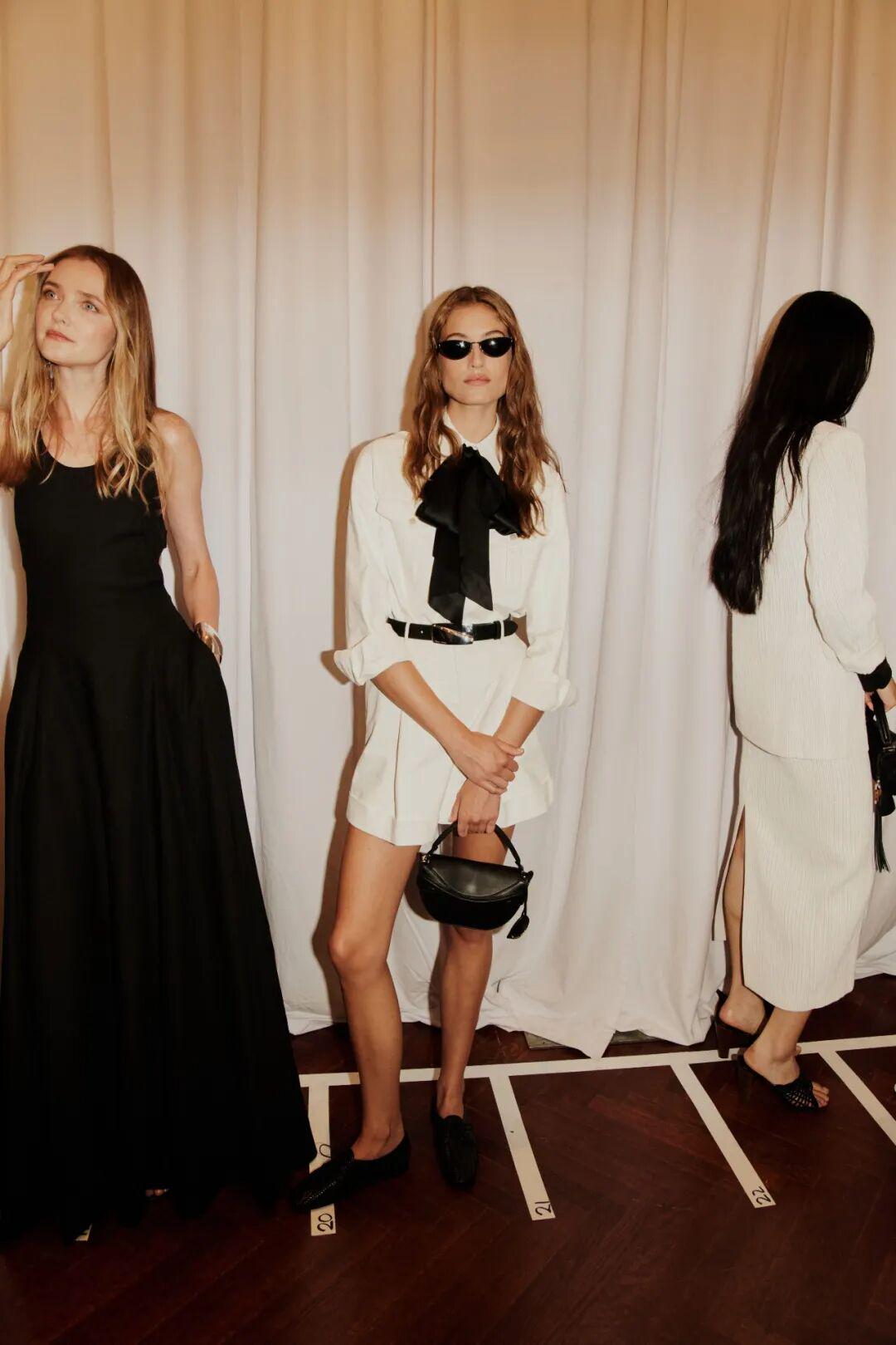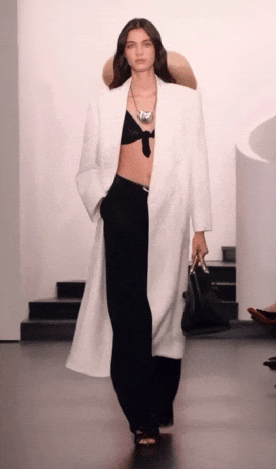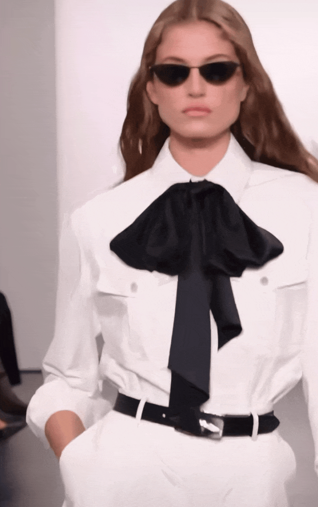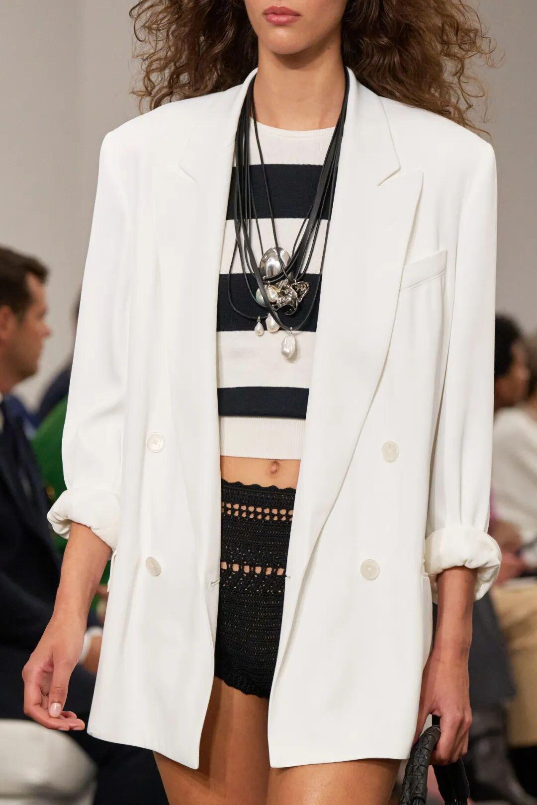 Ralph Lauren高明的地方在于他会用柔和的元素来打破这种板正。白色西装和大衣利落地敞开,里面是一件黑色胸衣。