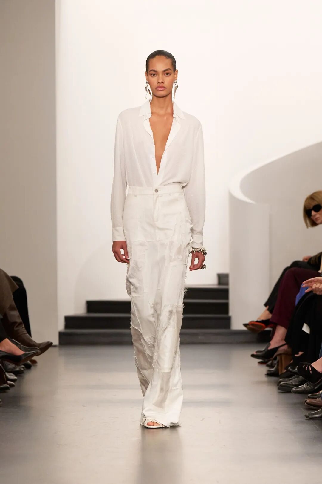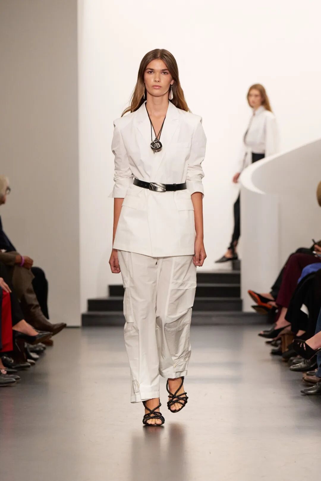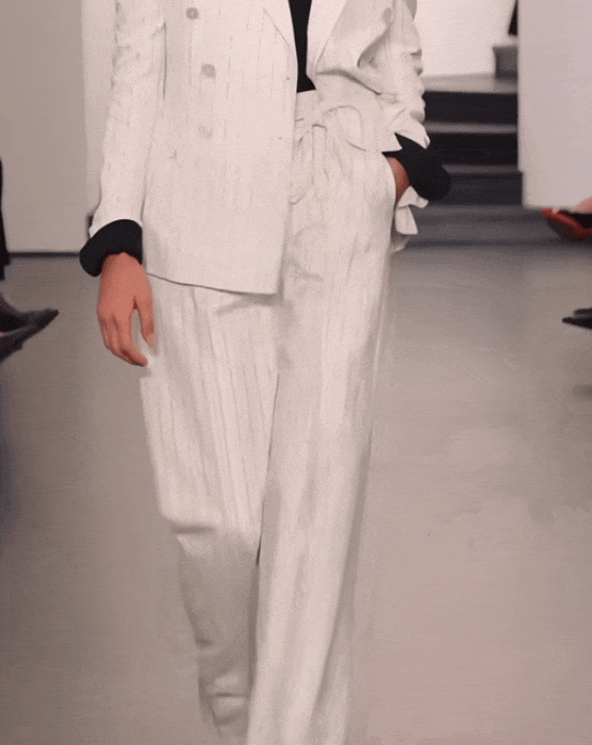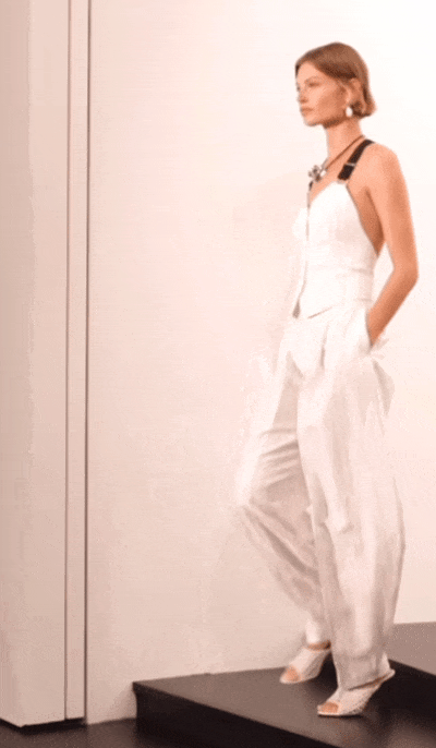 Ralph Lauren高明的地方在于他会用柔和的元素来打破这种板正。白色西装和大衣利落地敞开,里面是一件黑色胸衣。