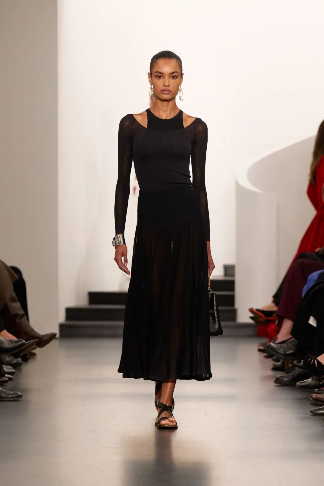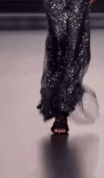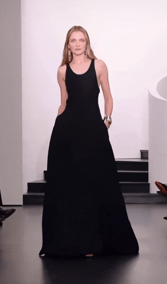 这次的秀上同样也有一些低调却有质感的晚宴造型。黑色无袖长裙线条简洁干净,裙摆微微张开,适当的量感能带来自然的力量感。