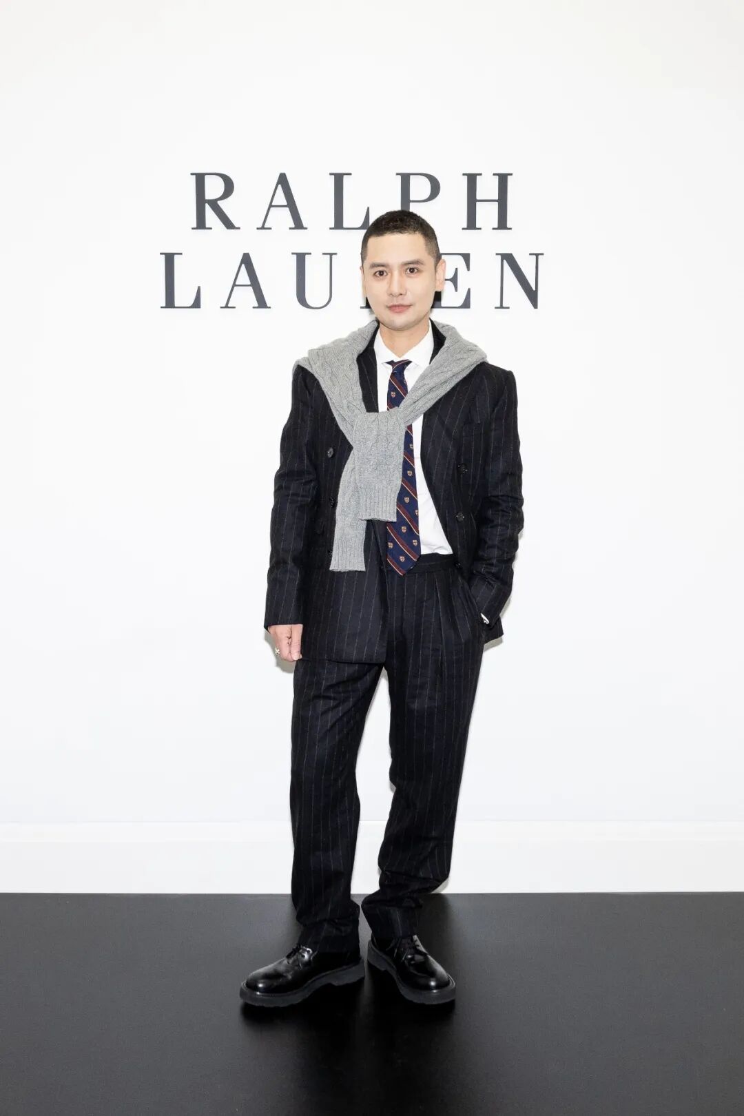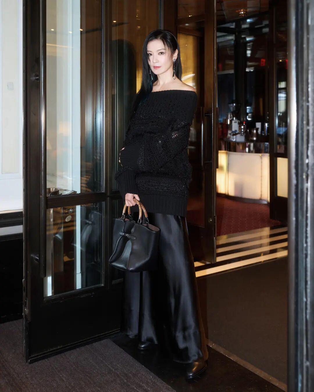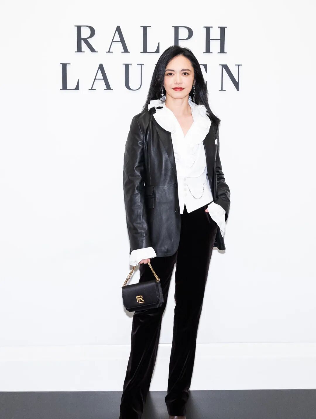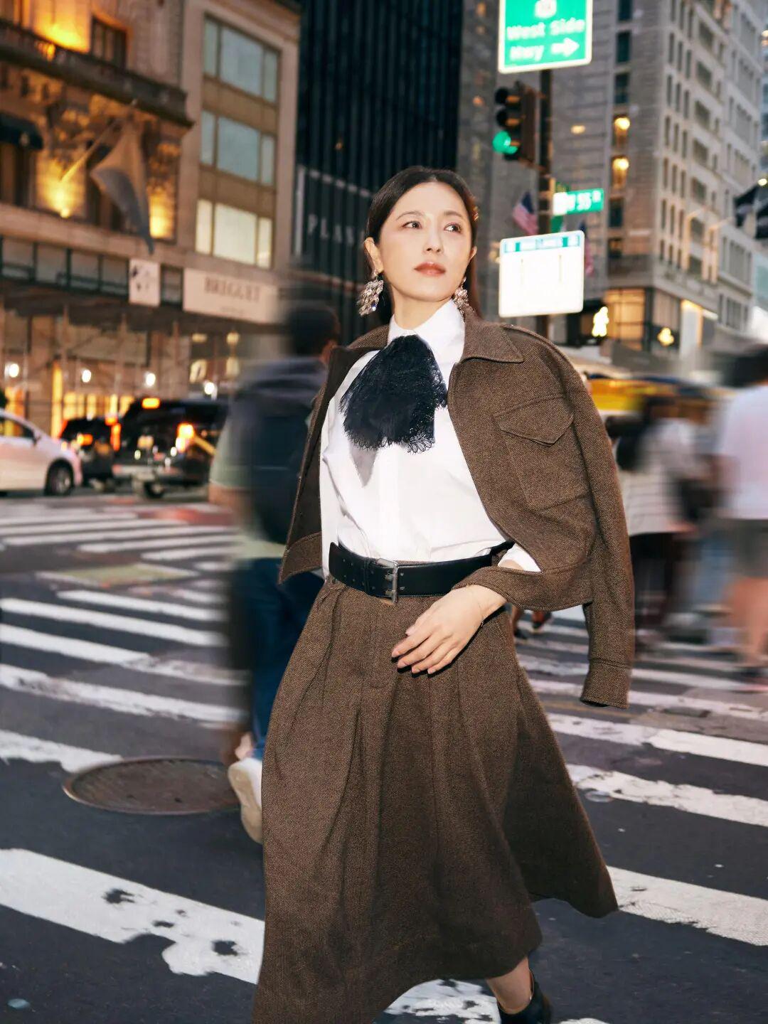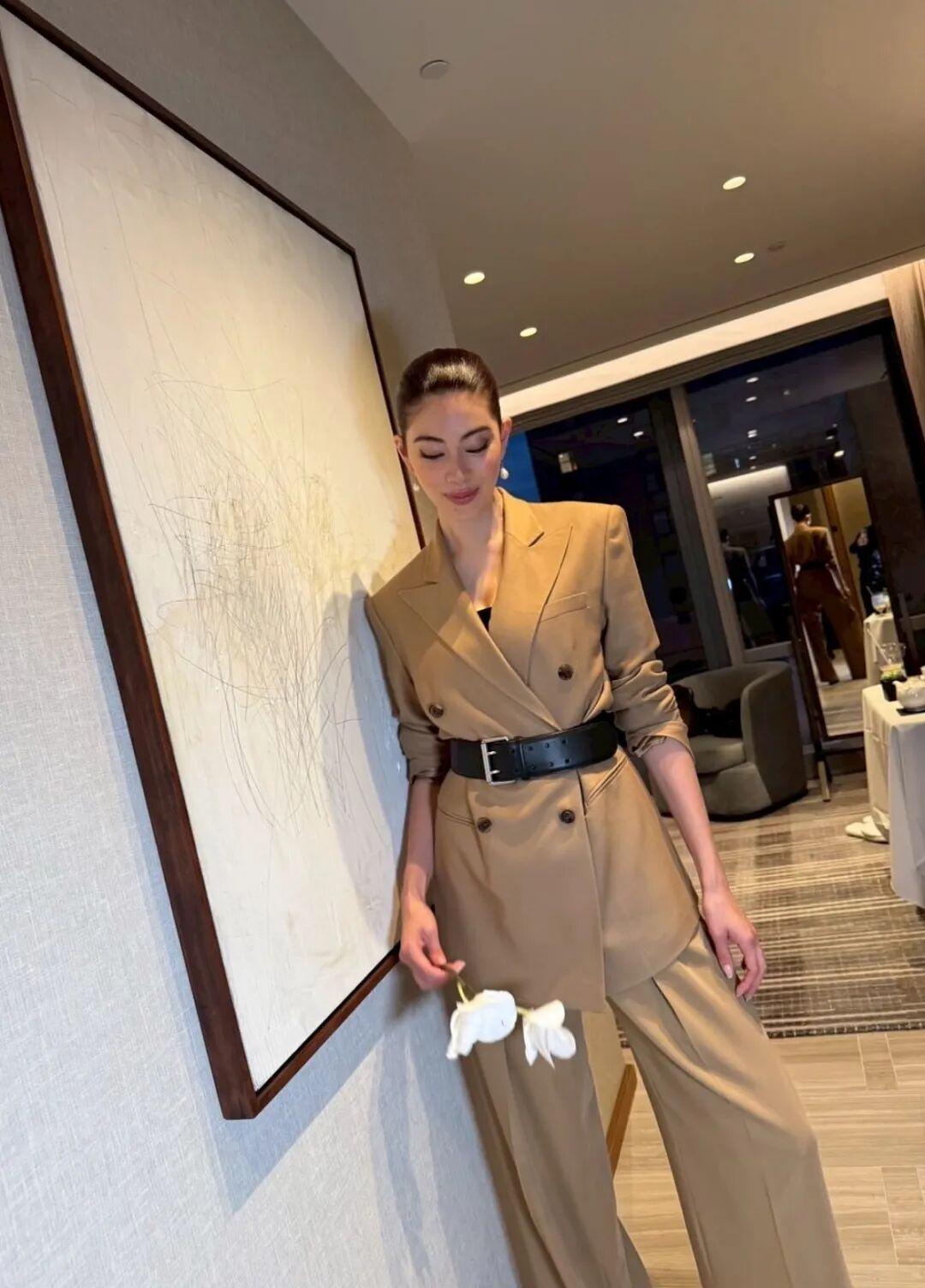 她笑容依旧明媚大方,穿着Ralph Lauren短西装夹克,稳重之中又透着点俏皮,配上超长半身裙把她的比例衬得很好。