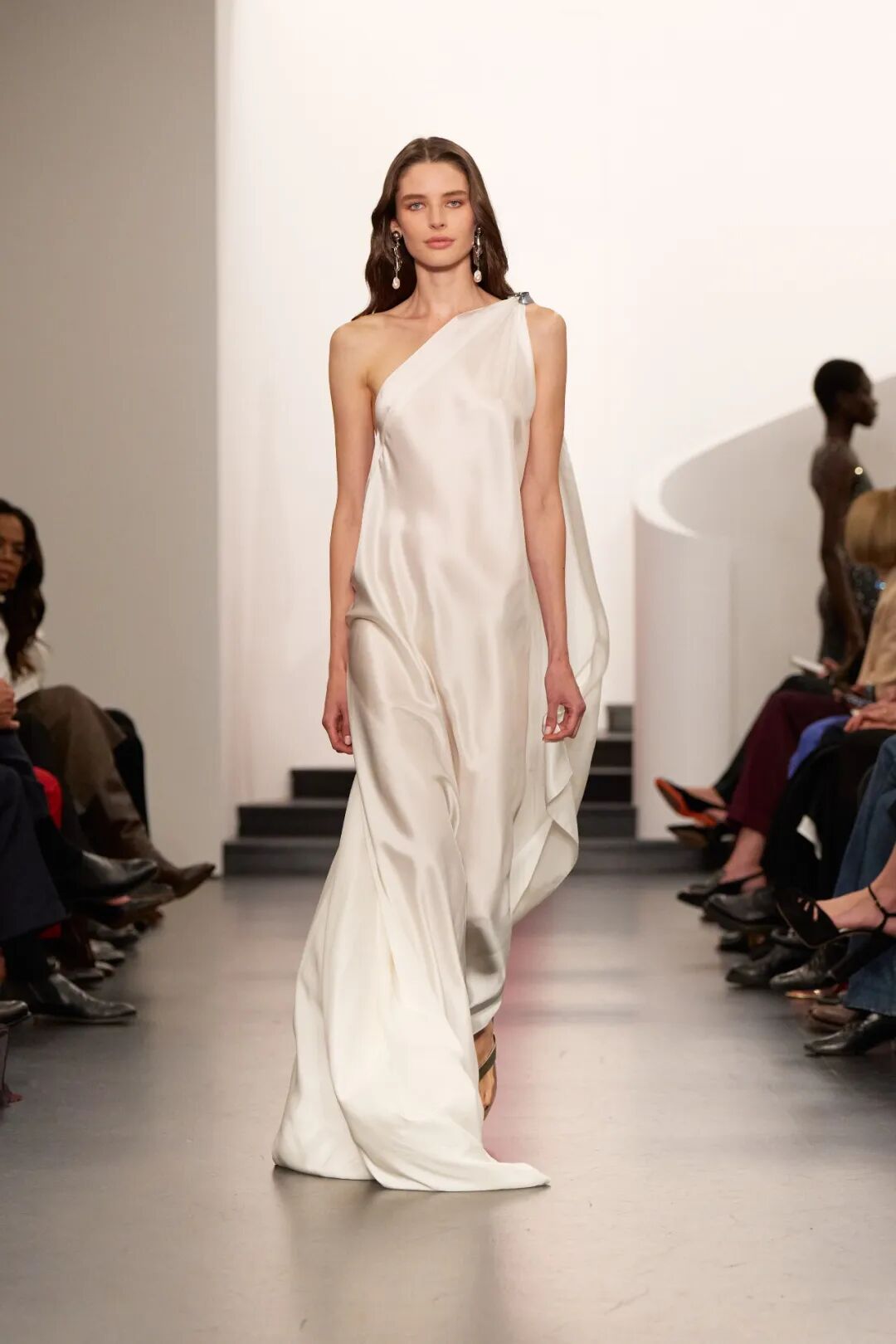 但我觉得最出彩的还是这条白色的单肩丝绸礼服。