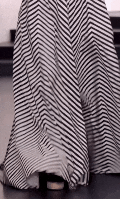 度假的精髓不是繁复的装饰,而是让身体和衣服都回归到最自然的状态。但最能体现 Ralph Lauren“ 大道至简 ” 的剪裁功力的还是这条黑白斜纹的拖地长裙。