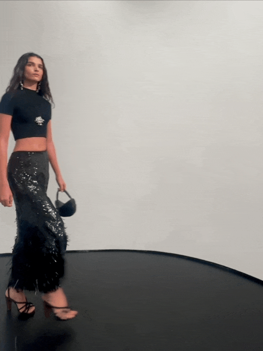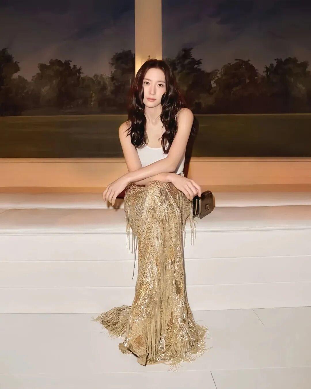 另一件亮片长裙则更直接,密集的小亮片像薄薄一层夜空覆盖在身上,效果华丽却不张扬。