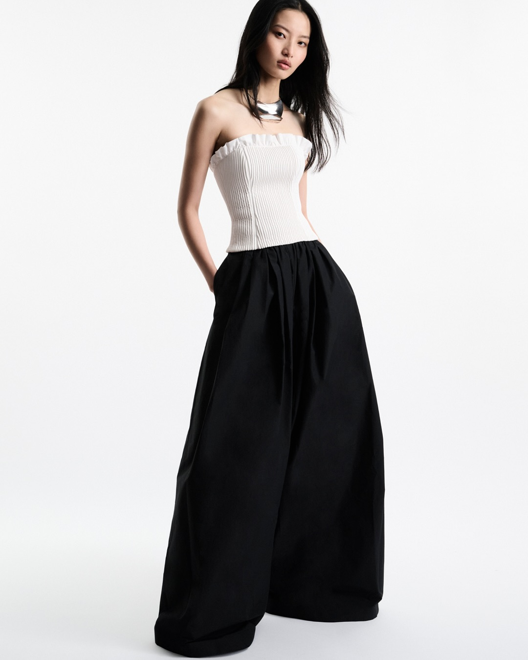 上半身像盔甲,下半身则是轻盈的褶皱,走动间硬挺和柔软的质感制造出强烈的反差。