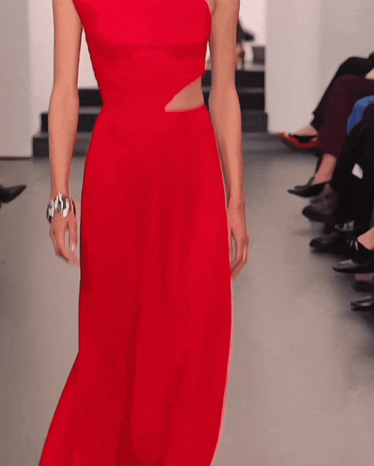 这条红色单肩礼服看起来干脆利落,但越看越能体会其中的分寸感。斜裁的褶皱让身体线条被自然勾勒,腰间的镂空则处理得极为克制。