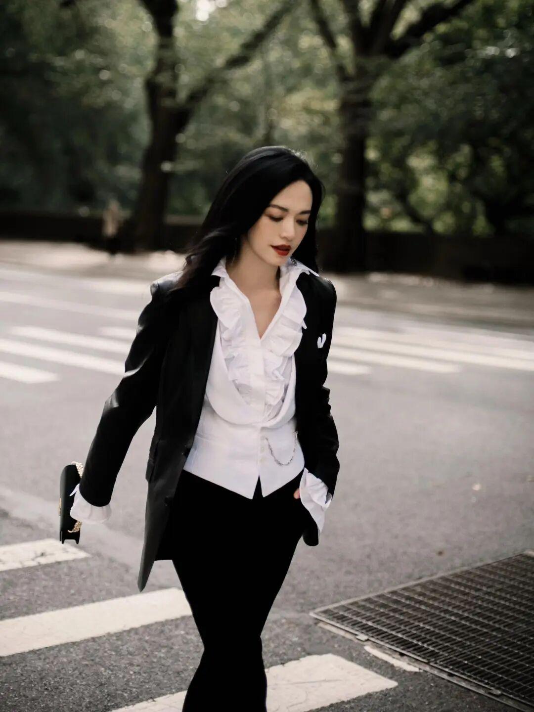 白色衬衫式上衣带有工装口袋与硬挺的结构感,袖子挽起,完全是女高管的干练做派;但胸前那条夸张的黑色蝴蝶结却打破了这种秩序,浪漫又俏皮。